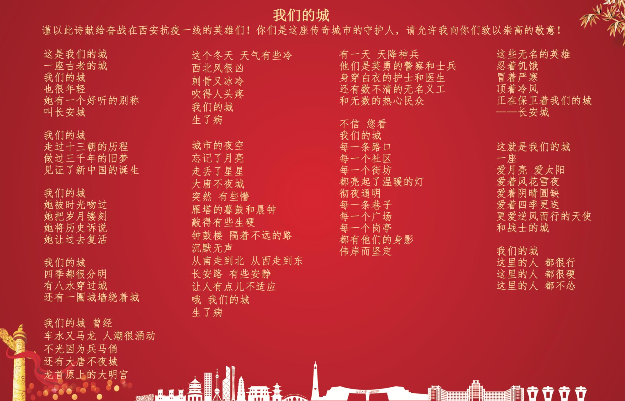 本诗以时空转移为视角,共分为四个层次。诗歌首先回顾了古城西安悠久的历史背景和著名的文化名胜古迹,之后从古及今,回放了疫情爆发前热闹喧嚣的生活场景,然后将镜头投射于无数在西安的大街小巷奋战在抗疫一线的英雄,最后一节以简短的排比结构,盛赞西安人民百折不挠勇于牺牲的奉献精神和坚定性格。