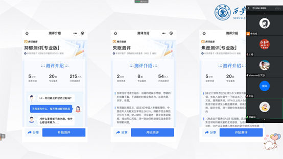 首先,班会的第一个环节是“数据收集——心理测一测”。“腾讯健康”小程序中的健康测一测板块囊括了心理测评、健康测评和儿童测评等系列测评和专业解读。聚焦心理方面,大家一同做了抑郁测评、失眠测评和焦虑测评,并就测评结果进行了讨论。