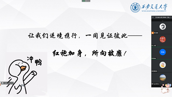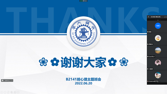 随着班会接近尾声,大家纷纷表示可以多多举办云端相聚的活动,不仅有利于大家沟通交流,也能够让大家重新整理心情、再出发!最后,博2141班“逆境携行,一起向未来”心理主题班会圆满结束。