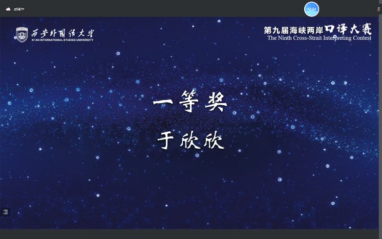 第九届海峡两岸口译大赛西北区级赛分为主旨口译和会议口译两个环节,大赛主题为“未来技能(Future Skills)”。比赛过程中,首轮主旨口译实行淘汰制,于欣欣得分第二,与其他十位选手进入第二环节。在会议口译中,于欣欣表达流利,信息全面,沉着冷静,翻译流畅,展现了扎实的专业知识、良好的译员素养和优秀的口译能力,最终拿下全场最高分,获得本次比赛第一名。
