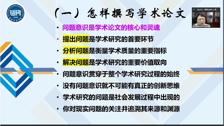 11月1日晚,外国语言文化论坛第222讲暨国别与区域研究系列讲座第13期以线上形式顺利举办。本次论坛的主题为“学术论文写作与规范”,由中国社会科学院世界经济与政治研究所编审、国际关系学院《国际安全研究》主编谭秀英老师主讲。论坛由外语学院副院长王华教授主持,学院部分教师、多个学院研究生以及国内多所高校师生300余人在线上共同聆听了报告。