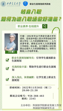 研究生会于11月30日晚线上举办了职业生涯规划系列讲座之《转身入职,如何为进入职场做好准备》主题讲座。