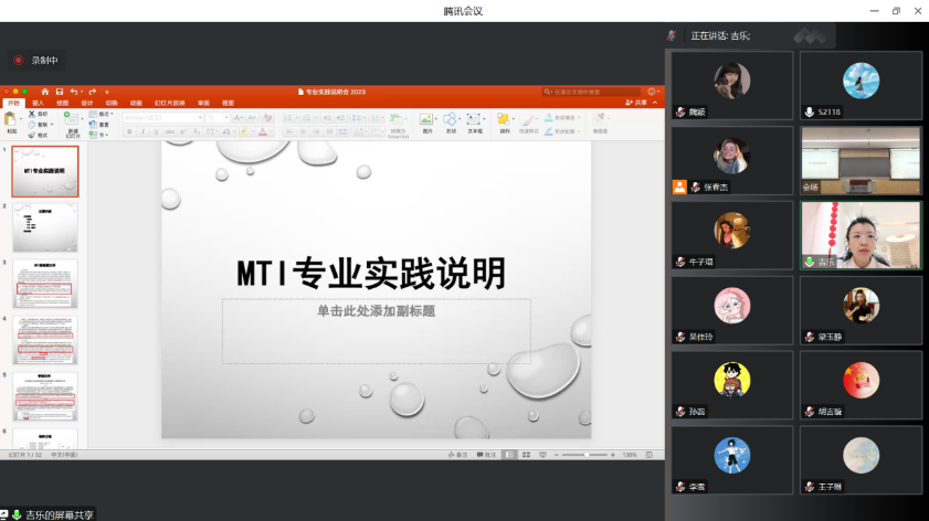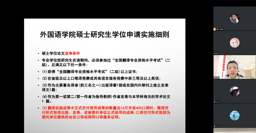 接下来,吉老师进一步总结,从“MTI专业实践说明”这一方面,为学生们细致讲解了培养方案以及专业实践要求的相关内容,结合MTI专业学生所聚焦的翻译实习与考核,细致分析相关内容,解读相关学位要求,帮助学生们进一步理解未来实习和毕业要求。此外,吉老师也为学生们深入讲解了本专业学生未来所能够从事的岗位以及相关要求,吉老师指出,目前语言服务行业需要的工作岗位不仅仅有口笔译方面,也包含项目运营、技术沟通、传递思想以及全球治理等各个方面,同学们可以拓宽视野,勇于尝试,熟悉行业流程,在实践中找准自己的方向。同时,吉老师也针对学生们聚焦的常见问题,逐一解答同学们的疑问。吉老师的总结讲解帮助大家进一步了解专业的发展,指明了方向,让学生们对专业学习以及职业规划有了更加全面与清晰的认识。