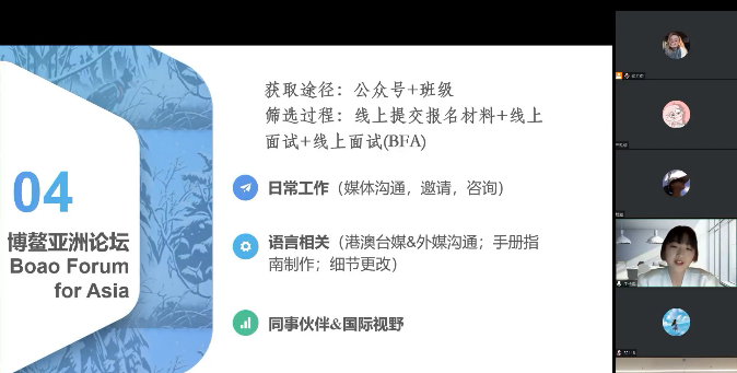牛子琨首先分享了自己两段企业实习经历,包括实习获取途径、选拔过程、实习流程、工作内容以及个人收获等全方位的内容,让同学们对实习工作有了全面而清晰的认识。其次牛子琨介绍了自己的口译实践经历,重点分享了目前仍在进行中的博鳌亚洲论坛实习生活,她鼓励同学们勇于尝试、积极申请国际组织实习机会,努力走向更大更广阔的舞台。