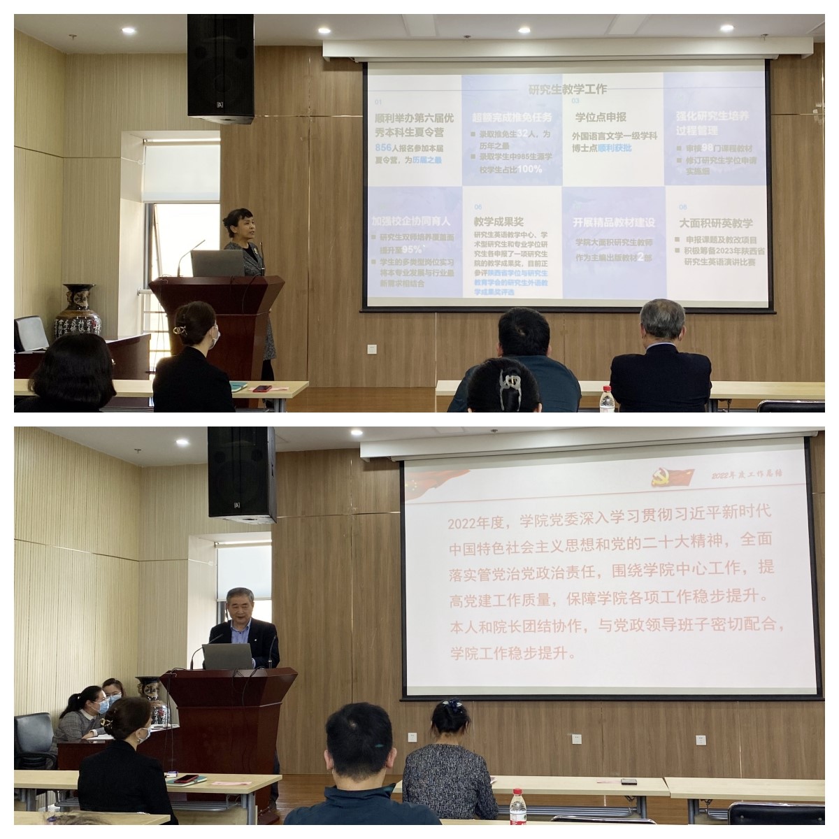 学院党委书记张长安从党建引领、推进党建业务融合发展、基层党建成效、全面从严治党等方面总结了学院党委一年来的工作。2023年,学院党委将以学习宣传贯彻党的二十大精神为抓手,充分发挥党建引领和党员干部模范带头作用,凝心聚气,为学院各项事业发展做好坚强保障。