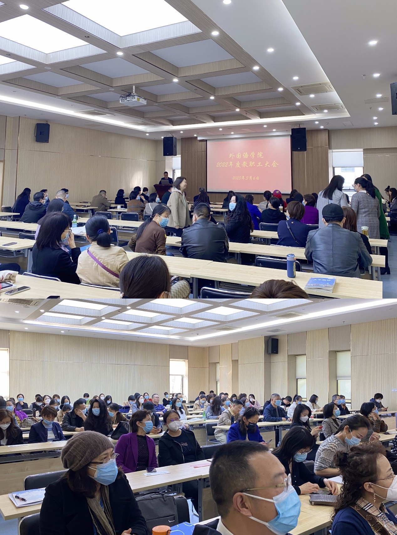 在外文逸夫楼B1001报告厅召开全院教职工大会,由学院工会主席邱鹄主持。大会分两个部分,第一部分是学院领导班子述职述廉及民主测评,第二部分是表彰环节。