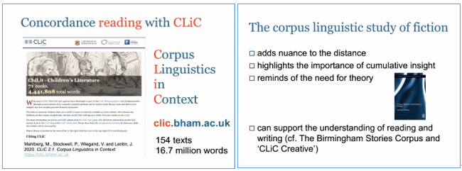 论坛继续沿用高端访谈、专题讲座、问答互动的模式,首先由McEnery教授对Mahlberg教授进行深度访谈,围绕其学术成长经历、狄更斯小说研究、数字人文研究、文学研究与合作等问题展开,然后结合文学语料库研究的学科交叉性和前沿性展开对话。专题讲座部分,Mahlberg教授从“数字人文”的概念入手,以伯明翰大学开发的在线语料库CLiC为例,讲述了语料库用于文学研究的思路和方法,并着重展示了如何通过CLiC来检索和分析狄更斯小说中的特定语言现象。问答部分,Mahlberg教授和McEnery教授就CLiC平台应用的具体问题、优势不足、未来发展进行了展望和探讨,并就语用学、认知语言学和文体学研究的关系进行了交流。