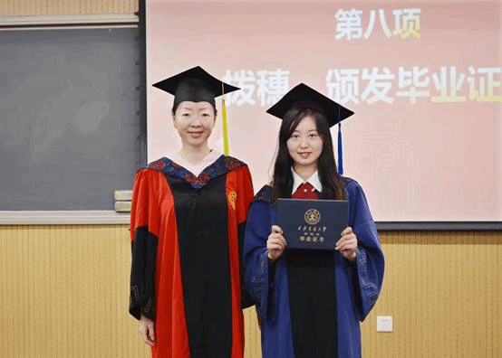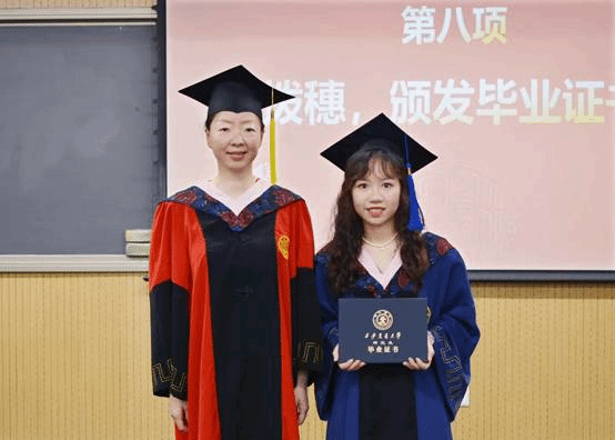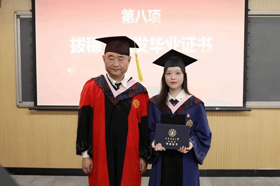 在学位授予仪式上,毕业生一一上台接受拨穗,领取毕业证书,并与老师合影留念,老师也为每位毕业生送上美好的毕业祝福。