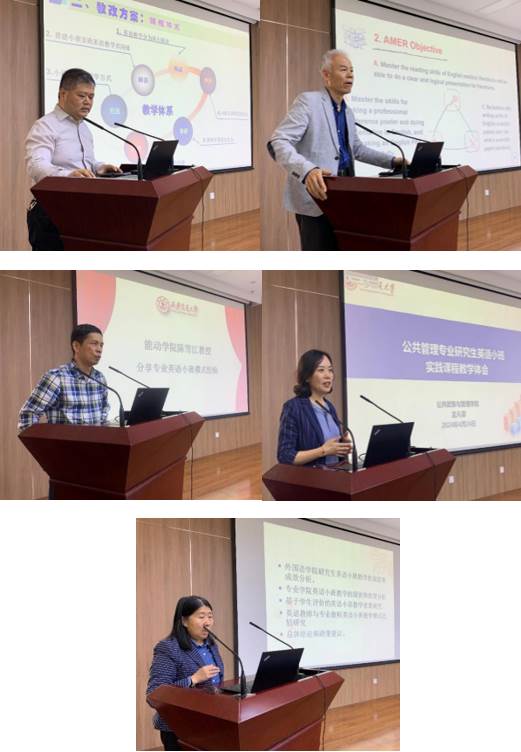 研究生英语教学中心主任冯广宜副教授介绍了通用英语小班教学方法,医学部吕社民教授、能动学院陈雪江教授和公管学院孟凡蓉教授从各自专业出发,介绍了不同学科的专业英语教学实践经验。研究生教研督导组组长王昕红教授汇报了教研组对研究生英语小班实践课程教学模式的评估和研究成果。