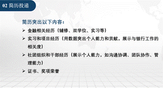 在简历撰写方面,毕熙亚建议同学们突出展示金融相关经历、实习和项目经历、社团组织和干部经历、各类证书和奖项荣誉。在笔试方面,她指出不同银行的侧重点不同,题型包括行测、公基、时政、英语、金融经济知识等。在面试方面,她分享了无领导小组讨论和半结构化面试的技巧,提醒同学们在面试时要注意发言时长和内容的把握。