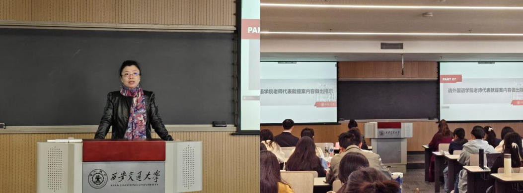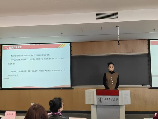 MTI教育中心主任吉乐老师就提案内容做出指示。吉乐老师对于同学们参与研代会、积极建言献策并对提案做出思考的态度表示认可。她指出,意见建议可以从教学、生活、教务三方面有针对性地提出。同时她对于提案中教学与培养方面的案例做出了说明与建议,如和留学生之间开展交流活动、举办MTI论坛等。随后,语言研究中心主任卢燕华老师对于有关学术课程的案例做出了简要说明。教务主管左佳老师从教务方面对研究生选课排课、课程学分方面提案做出解释与建议。最后,团委副书记薛璇玑老师针对学院公共设施、研究生职业发展、心理健康讲座等提案做出了指示。