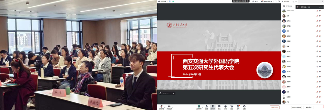 研究生分会的工作情况进行了总结。2023-2024学年,外院研会文体部顺利举办了金秋外语节、健康活动月系列体育赛事、四院联合毕业晚会等丰富多彩的文体活动;职业发展与对外联络部成功筹备了研代会,举办了职业生涯规划系列讲座,帮助同学了解行业发展知识;宣传部圆满完成各类宣传运营工作,如运营“XJTU 免费色情影片