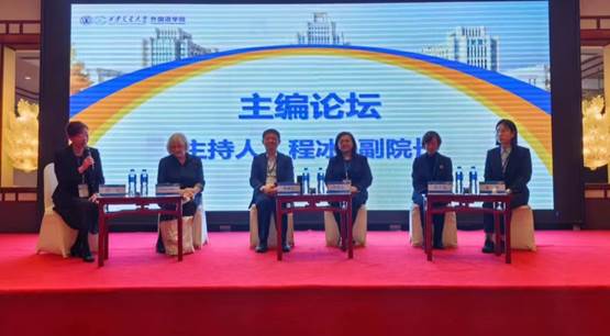 主编论坛作为压轴环节,聚焦大家普遍关心的学术发表问题,为与会者提供了宝贵的与主编们面对面的交流机会。论坛中,来自Journal of English for Academic Purposes的主编Hilary Nesi博士,《外语与外语教学》的主编邓耀臣教授,《外语教育研究前沿》的副主编常小玲博士,《中国ESP研究》的主编李莉文教授,以及《外语导刊》编辑高一瞳女士分别介绍了各自期刊的办刊理念和特色,为ESP领域的研究者提供了有针对性的投稿建议。在互动环节,主编们就选题策略、如何提高稿件质量以及AI对学术投稿的影响等话题展开了深入讨论,为ESP领域研究者的学术发表提供了有益的参考和启发。