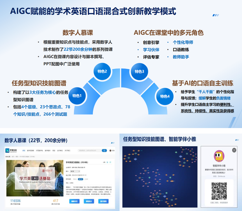 钱希带领学术英语教学团队(主要成员:孟亚茹、杨扬、何惠勤、刘秀蓉等)成功入围了全国总决赛,参赛项目题为“AIGC赋能的学术英语口语混合式教学模式的构建与实践”。总决赛分为8分钟的项目报告阐释以及4分钟的专家问辩两个环节,团队负责人钱希代表团队进行了答辩,着重阐释了课程中AIGC融入教学的特色与亮点以及团队开展的相关实证研究,汇报的智课特色包括:依托该课程的陕西省首门数字人慕课、任务型知识技能图谱、智能体“语伴小雅”、基于AI工具的口语自主训练等。专家评委结合项目报告书、项目3D Show展示等,从项目创新创意、技术实现、实用价值等维度进行了综合评价,对于项目的设计以及AIGC在课程全环节的有机融入给予了高度评价,认为该案例具备在全国进行推广的价值。