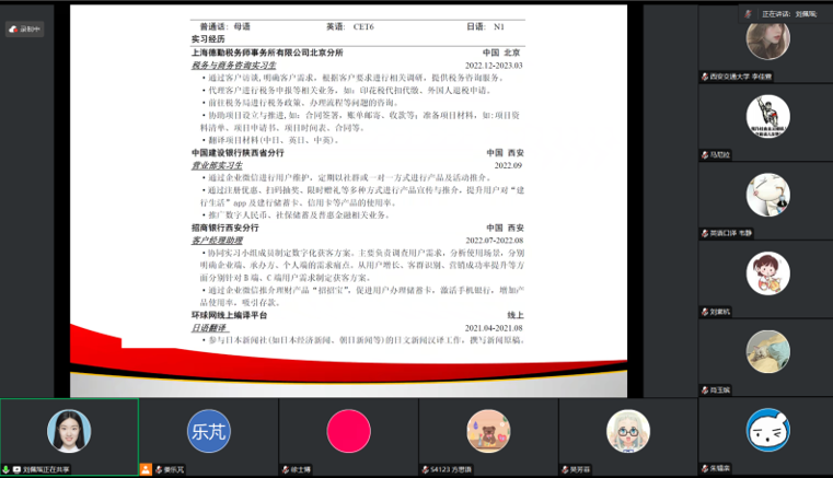 讲座伊始,刘佩瑶分享了自己的实习经历,包括环球网新闻编译、外研社日语词典数据库维护、翻译公司校对等线上实习,以及招商银行客户经理助理、建设银行营业部实习生、德勤税务实习等。她认为,对于想找专业对口工作的同学,新闻社出版社是很好的选择;银行实习对专业限制较少,但更注重综合能力和营销思维。此外,她还分享了德勤实习的经历,包括转正机会和招聘流程。最后,她提醒非英语专业同学注意对AI面试的准备。