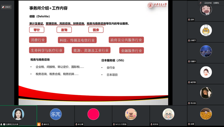 接着,刘佩瑶分享了事务所面试经验,主要是群面和经理面试,并介绍了事务所的基本情况和工作内容。群面中晋级人数与队友、面试官风格、题目难度等因素有关,不管担任什么角色,都要对方案的形成带来正向可视的作用。经理面试主要考察求职意向和职业发展愿景,鲜少涉及专业问题。合伙人面试一般从细节中观察面试者是否适合这一行业。事务所业务分为审计咨询、税务和商务咨询三大类,涉及六大行业板块。税务与商务咨询根据企业税种分成不同服务组,具体工作内容包括税务咨询、税务合规、税务抗辩等。