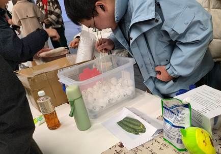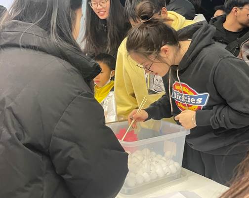 参与者手持长筷,从装满字母乒乓球的箱子中精准夹取对应字母,放入碗中,正确补充出题板上的单词,动手又动脑,现场紧张又充满乐趣。