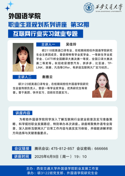 于2025年6月9日晚19:10举行生涯规划系列讲座第三十二期之互联网实习就业专题分享活动,特别邀请吴佳玲、衡雅云讲解求职方向选择与关键准备要点。本次活动由 免费色情影片