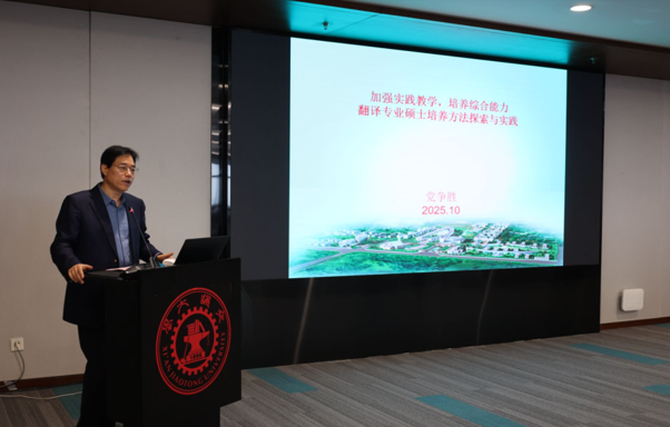 首先,全国翻译专业学位研究生教育指导委员会委员、西安外国语大学原副校长党争胜以《加强实践教学、培养综合能力:翻译专业硕士培养方案探索与实践》为题作主旨报告。他强调,面对人工智能带来的变革,翻译教育界应秉持“赋能而非替代”的理念,积极应对挑战。MTI教育应进一步明确培养特色,积极响应《中华人民共和国学位法》对人才培养质量提出的更高要求,着力培养学生的六大关键能力,坚持以实践为导向的教学模式。
