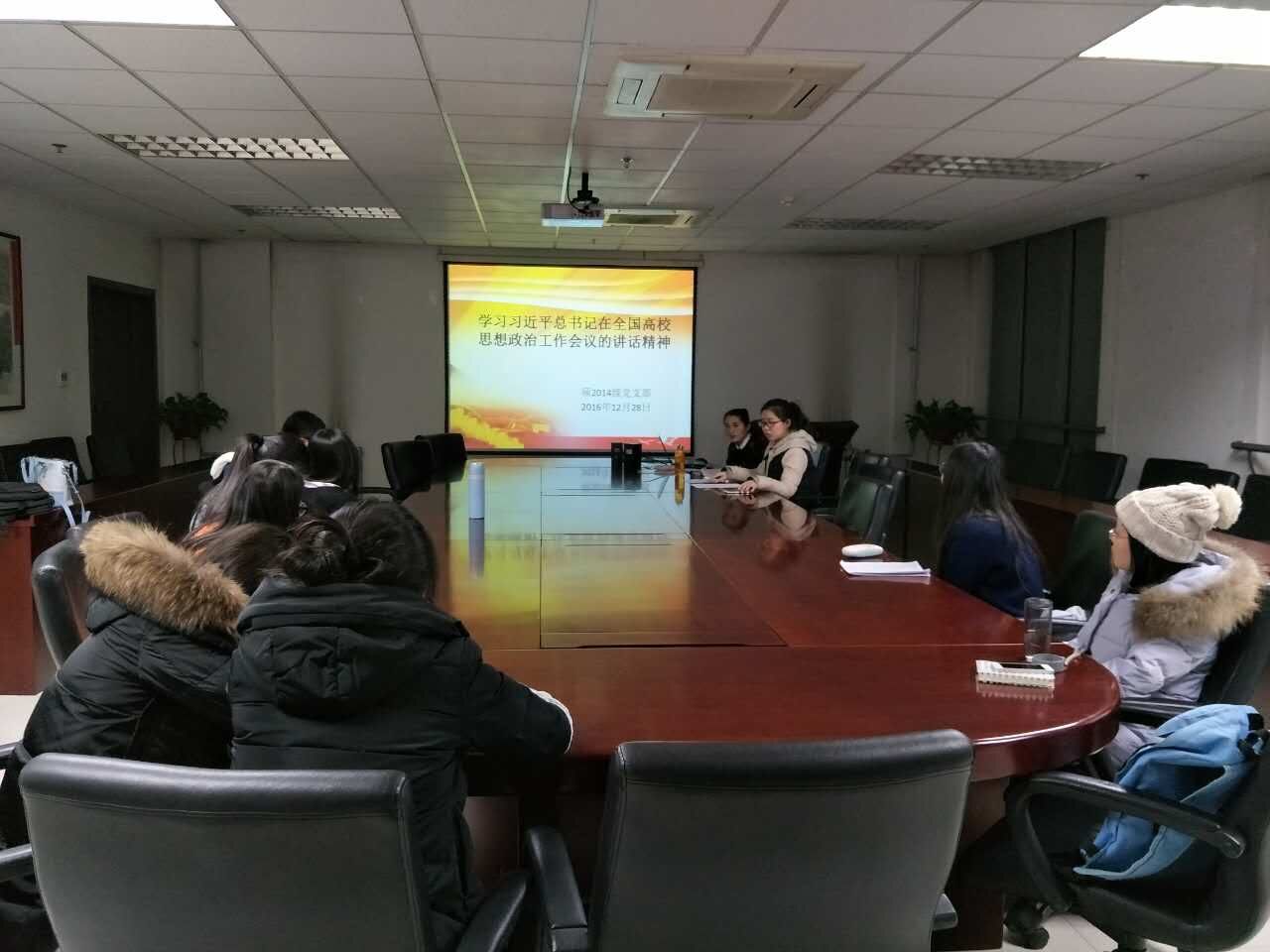 硕2014级学生党支部在外文楼B912召开了组织生活会,会议讨论并表决预备党员张琪珑同志的转正问题,并学习了习近平总书记在全国高校思想政治工作会议上的讲话精神。