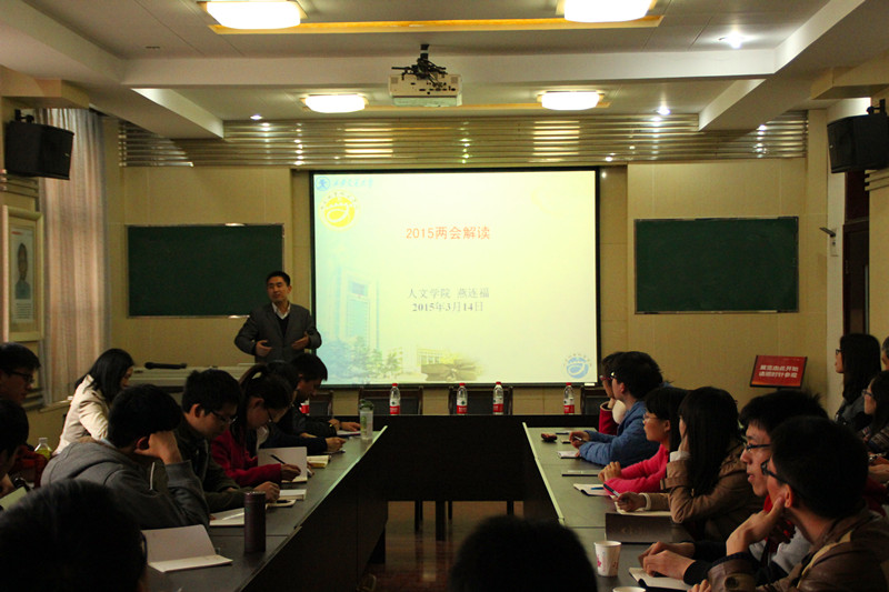 紧接着,燕连福教授以习近平总书记提出建设“美丽中国”的目标为核心,围绕2014年政府成绩、2015年政府11项新承诺、代表和委员的10个热点提案三个方面解读“两会”,灵活的语言、活泼的演讲风格让台下的学生洞若观火。燕教授在演讲中引用大量数据,表明政府在反腐倡廉、深化改革、改善民生等方面所做出的成绩和决心,并寄语机械专业学生充分利用自己优势,将中国由“制造大国”变身为“制造强国”,外语专业学生向海外展示中国振兴富强的风貌以及全国人民为实现中华民族伟大复兴而努力奋斗的精神。