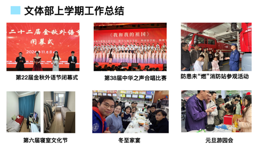 文体部负责人宋竹对过去一学期的工作进行了回顾,其中包括成功举办的金秋外语节、消防站参观活动、寝室文化节、冬至家宴和元旦游园会等一系列丰富多彩的活动。文体部也介绍了本学期详细的工作计划,包括3月份的趣味运动会、4月份的校运动会,以及备受期待的毕业晚会。