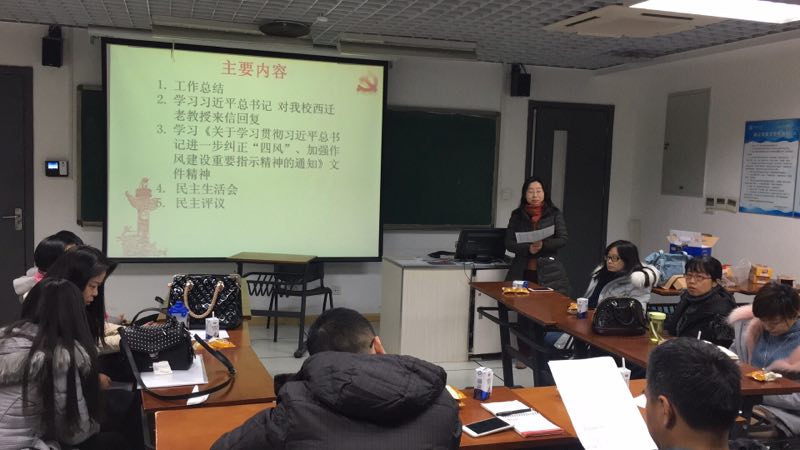 之后张长安老师对接下来党员的民主生活和民主评议提出了几点要求,希望党员能够客观看待自己的成绩与不足,既要肯定成绩,也要虚心接受大家的批评。在党员自评过程中,老师们纷纷对自己过去一年的工作学习作出客观坦诚的评价。邱鹄老师反思自己一年来的工作,感到自己存在诸多不足之处,如学习不够深入,在工作中缺少创新和开拓精神,在科研中有畏难情绪等。表示今后会深入思考,不断提高自己的党性修养,积极转变观念,开阔思路,努力向成为更高层次的专业人才方向发展。陈丽老师表示在工作上自己要不断加强业务学习,提高自身的工作能力,时刻谨记自己作为一名教师的责任和义务,在传授学生专业知识的同时,努力以自身的人格魅力影响学生;赵亚军老师认为自己还需要多多学习,来年要在研究上多下功夫;杨杨老师表示自评会上受各位老师的鼓舞,无论是工作、科研都要向更多上进的老师们学习;张静洁老师认为成绩是有的,但是更多的是要发现自己的不足加以改进。在过去一年中,她很享受参与集体活动与大家交流的机会;潘一老师在过去一年中兢兢业业完成各项院系任务,期待能够跟着支部这个大家庭一起成长进步。支部书记马琼对每位老师的自评做了点评,希望大家认真对待批评意见。