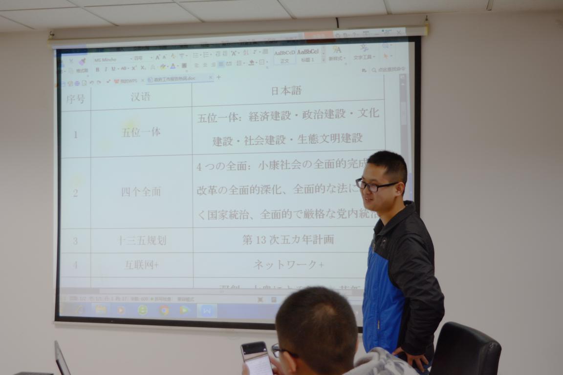 硕2017级党支部书记朱海博和组织委员和智鹏分别讲解了政府工作报告中热词的英文和日文翻译。两位同学的讲解引起了同学们对中国文化海外传播的关注和热情。