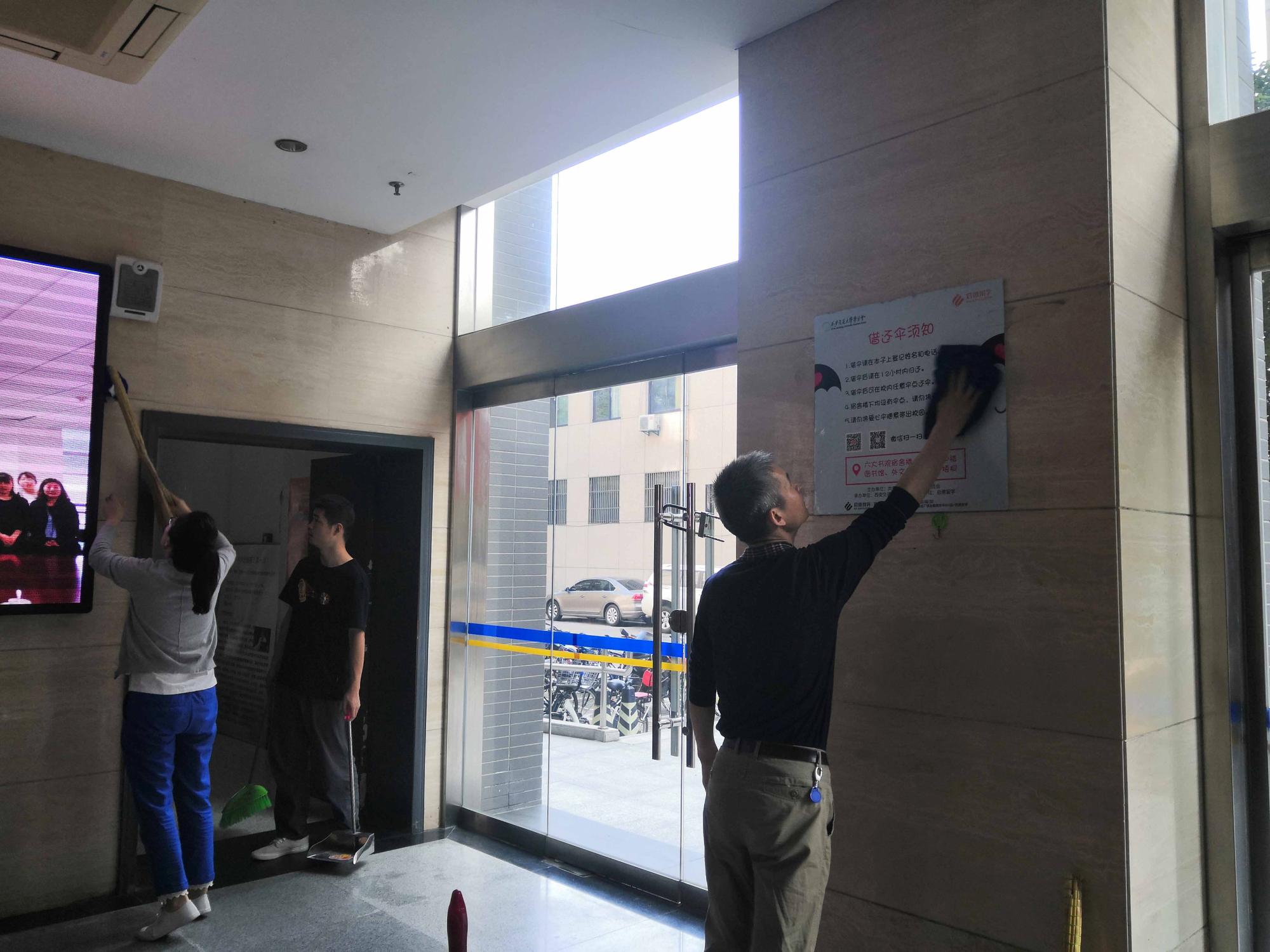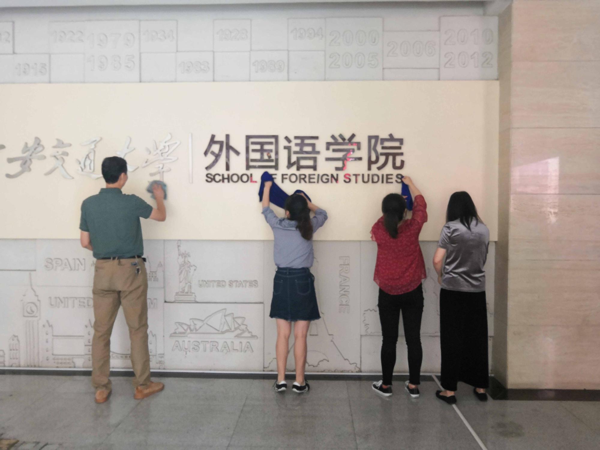 会后,支部成员与学院研究生开展义务清扫外文楼志愿服务活动,大家一起动手,对外文楼地面、玻璃、墙面等进行清洁,使外文楼面貌焕然一新。