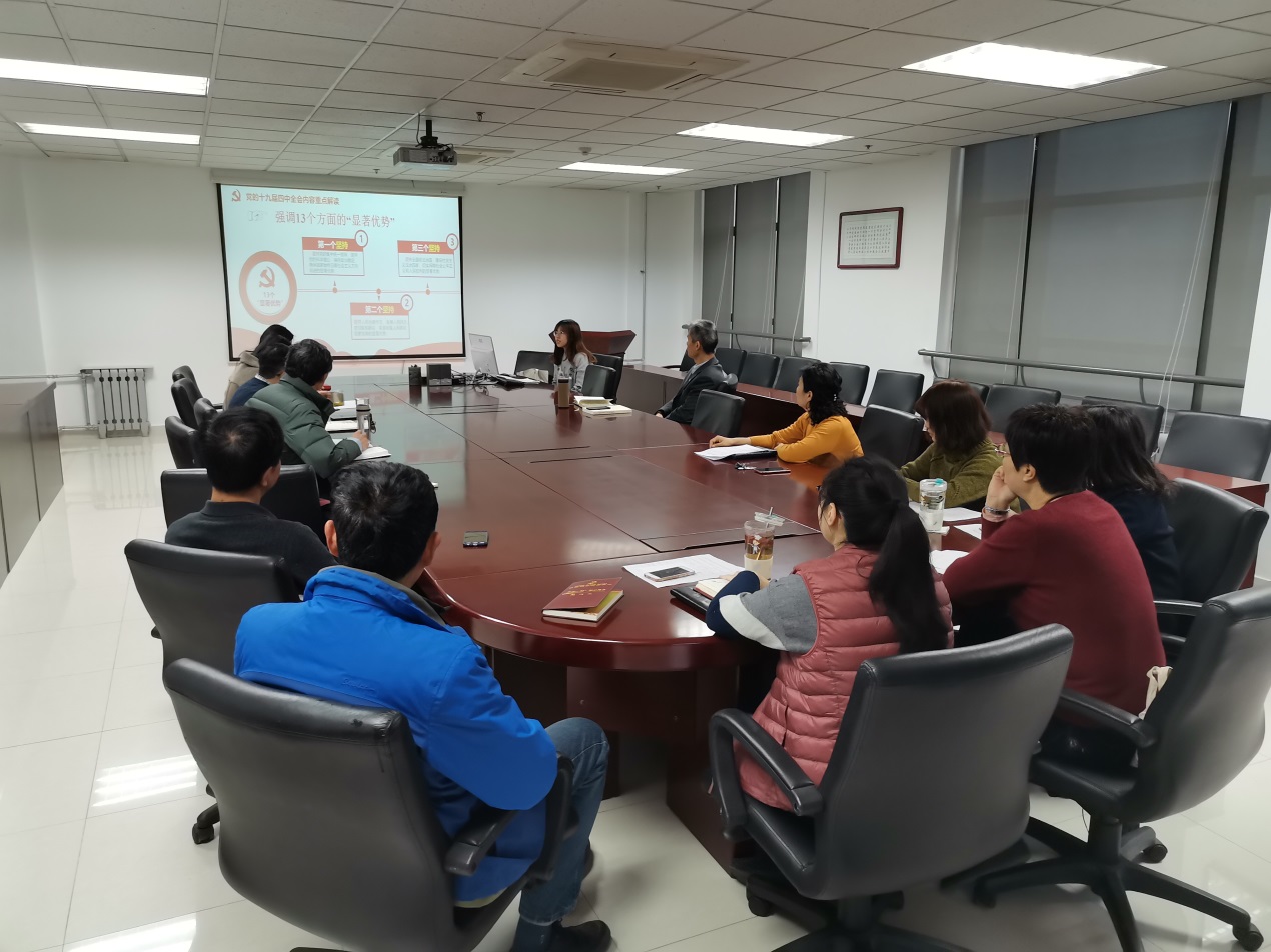 机关党支部在外文楼B912会议室召开专题组织生活会,学习党的十九届四中全会精神,进行支委会工作评议,会议由支部书记马薇主持,联系支部的副院长、分党委委员王华与会指导。