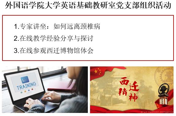 4月18日晚七点,大学英语基础教研室党支部党员准时在“腾讯会议”上线,参加本月的党组织生活会,会议由支部书记钱希主持。本次组织生活会主要包含三项内容:第一,支部特色活动---颈椎保健讲座。第二,在线教学经验交流与分享。第三,云游西迁博物馆,重温“西迁精神。”