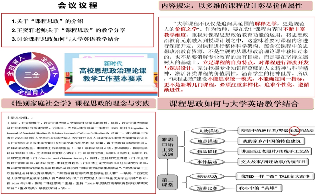 5月20日下午两点半,大学英语基础教研室党支部党员准时在“腾讯会议”上线,参加本月的党组织生活会,会议由支部书记钱希主持。本次组织生活会主要包含三项内容:第一,关于“课程思政”主题规定、内容规定和目标规定的介绍。第二,邀请社会学系副教授(研究员)、陕西省首届创新教学大赛一等奖获得者王奕轩老师给大家做关于课程思政教学的经验分享。第三,支部党员结合自己的大学英语教学谈如何开展课程思政。