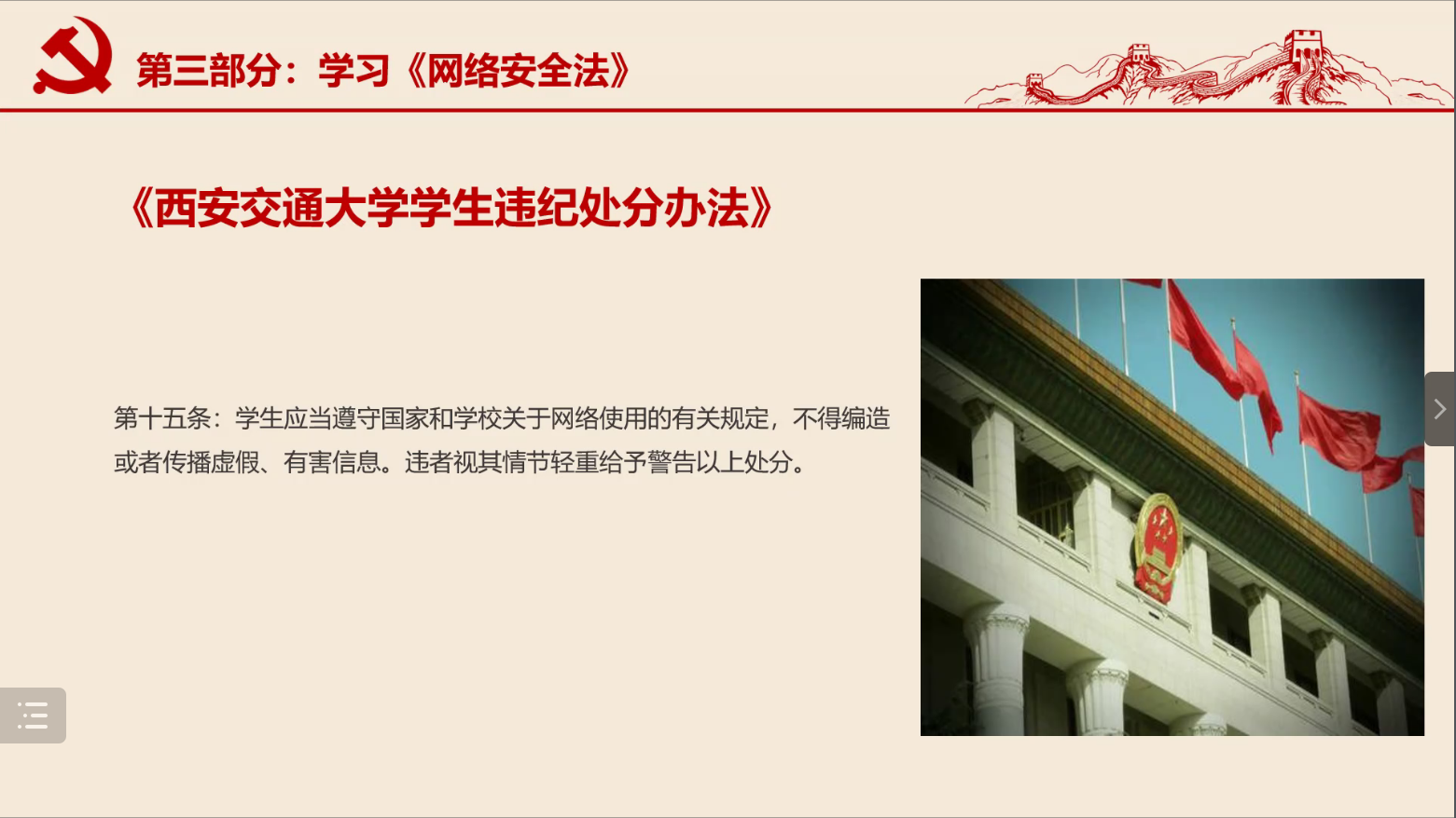 学生违纪处分办法》,强化法治素养,提高辨别网络信息的能力,做到不信谣、不传谣,自觉营造清朗网络环境,合法合理表达个人诉求。