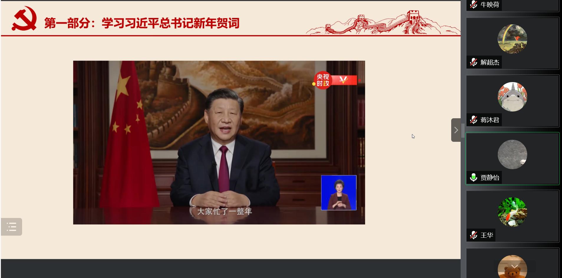 首先,同志们一起观看学习习近平总书记新年贺词节选。入党积极分子贾静怡和牛映荷分享了自己的想法,认为青年应充分秉承人文情怀,胸怀大局,时刻警醒自己奋发努力。郭顺鑫同志引用了习总书记的勉励作出总结,认为值此新年伊始之际,同学们应该脚踏实地,总结过去,放眼未来,为抗击疫情、服务人民做出贡献。