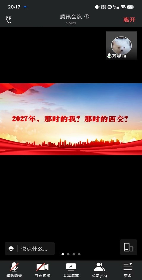 积极分子齐思雨同志表示,希望在不久的将来便能看到疫情的彻底结束,希望在未来的五年内,自己能够把握时代机遇,通过脚踏实地的努力找到理想的工作、实现自己的人生价值。在谈及学校发展时,齐思雨同志表示,希望在“十四五”期间,学校能够把握好“秦创原”等重大平台机遇,吸引更多优秀的师资力量,促进各个学科的全面发展,进一步提高社会影响力,不断在人才培养、科学研究、社会服务等方面为国家、为社会做出更大的贡献。
