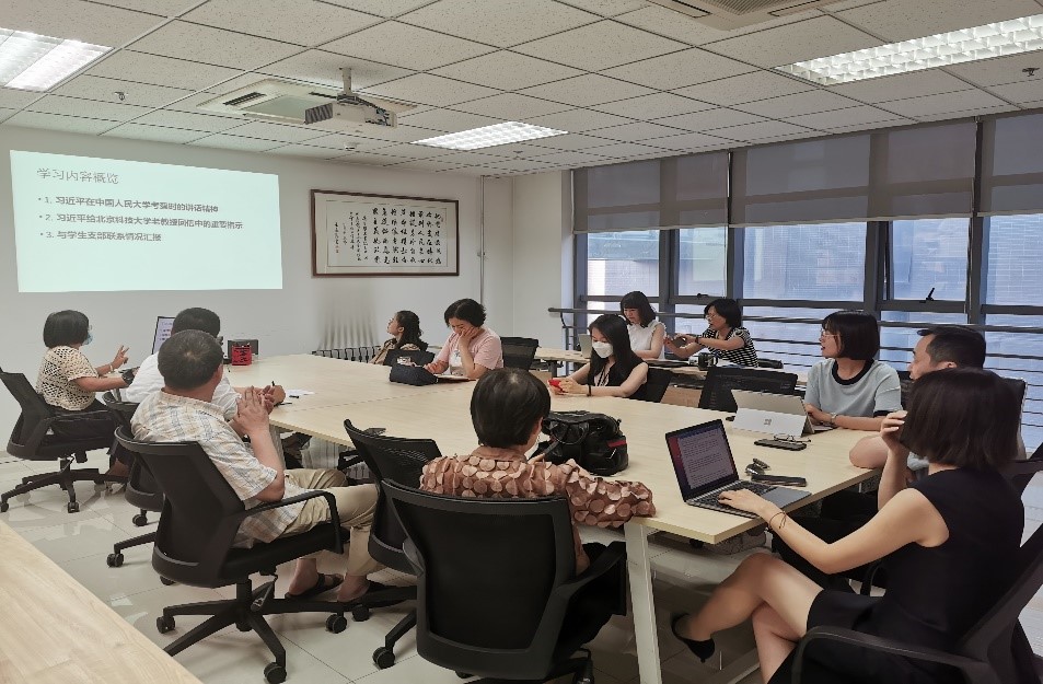 杜丽霞领学习近平总书记在中国人民大学考察时的重要讲话精神和习近平总书记给北京科技大学老教授回信的重要精神,随后介绍支部与本科学生党支部联系的情况。她说,教工党支部的核心使命是全力服务教研和专业建设,倾心致力于学生的培养和成才,加强与学生党支部密切联系、合力推进各项工作意义重大,是今后工作的重要内容。
