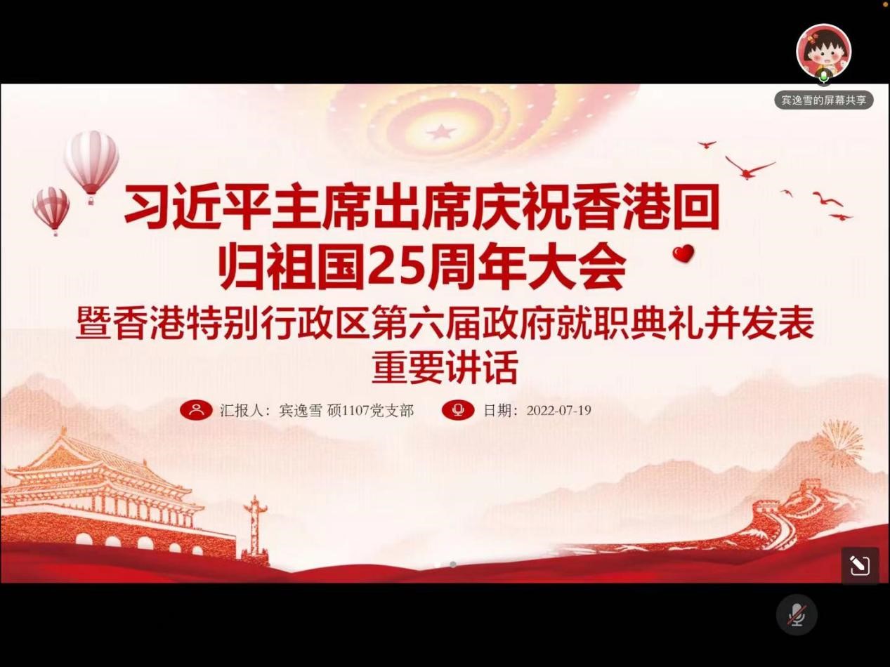 硕1107党支部在腾讯会议线上召开“庆祝香港回归,赓续百年奋斗经验”线上微党课,党支部书记李菲主持,宾逸雪,黄英琪,李园媛三位同志分享,支部全体党员及入党积极分子参加学习并交流分享心得体会。