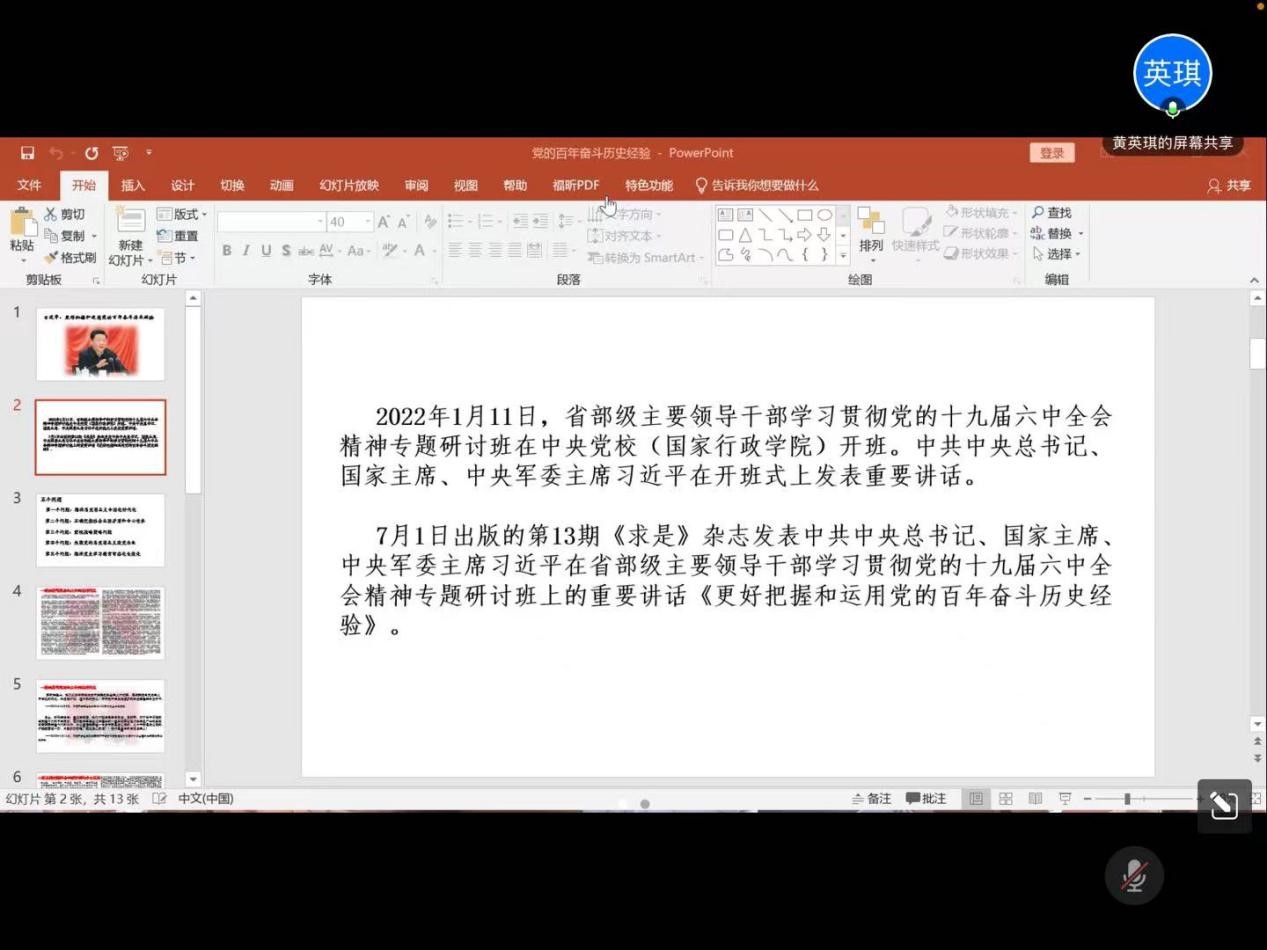 然后,黄英琪同学介绍了7月1日出版的第13期《求是》杂志发表中共中央总书记、国家主席、中央军委主席习近平在省部级主要领导干部学习贯彻党的十九届六中全会精神专题研讨班上的重要讲话《更好把握和运用党的百年奋斗历史经验》。同学们围绕五个问题展开讨论。第一个问题:推进马克思主义中国化时代化;第二个问题:正确把握社会主要矛盾和中心任务;第三个问题:重视战略策略问题;第四个问题:永葆党的马克思主义政党本色;第五个问题:推进党史学习教育常态化长效化。