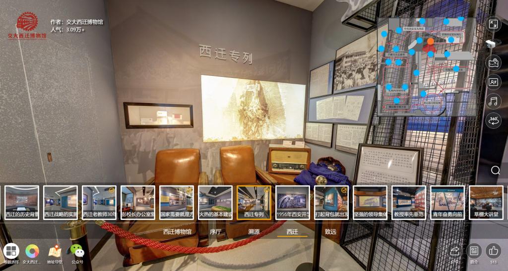 云参观将西迁博物馆的全貌展现在大家眼前。画面清晰,内容全面,上面不但有每个小部分的主题,更有雄浑激昂的《警醒歌》环绕在耳边。网上展馆共分为四个部分:序厅、溯源、西迁、致远。线下参观可以触摸历史,线上参观能够身临其境,大家以不同的方式感受不一样的环境和氛围,但内心都是同样的爱校荣校之情。