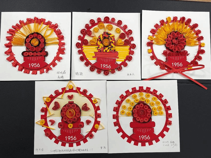 两个支部线下参与的同学们共同制作完成名为“衍纸”的红色手工活动。衍纸又称卷纸,是一种运用卷、捏、拼贴组合成样式复杂、形态各异的衍纸艺术。党支部定制了专属于校庆的图纸,同学们分工合作,在图纸底板上尽情发挥自己的想象力,将一条条单一的衍纸制作成丰富多彩的形状。在制作的过程中,大家满怀着对学校的生日祝福,活动室充满了欢声笑语。图纸上醒目的“1956”时刻提醒着我们要牢记伟大的“西迁精神”,用实际行动去书写爱国奋斗故事,谱写西迁报国之歌,继承先辈们的勇毅前行。