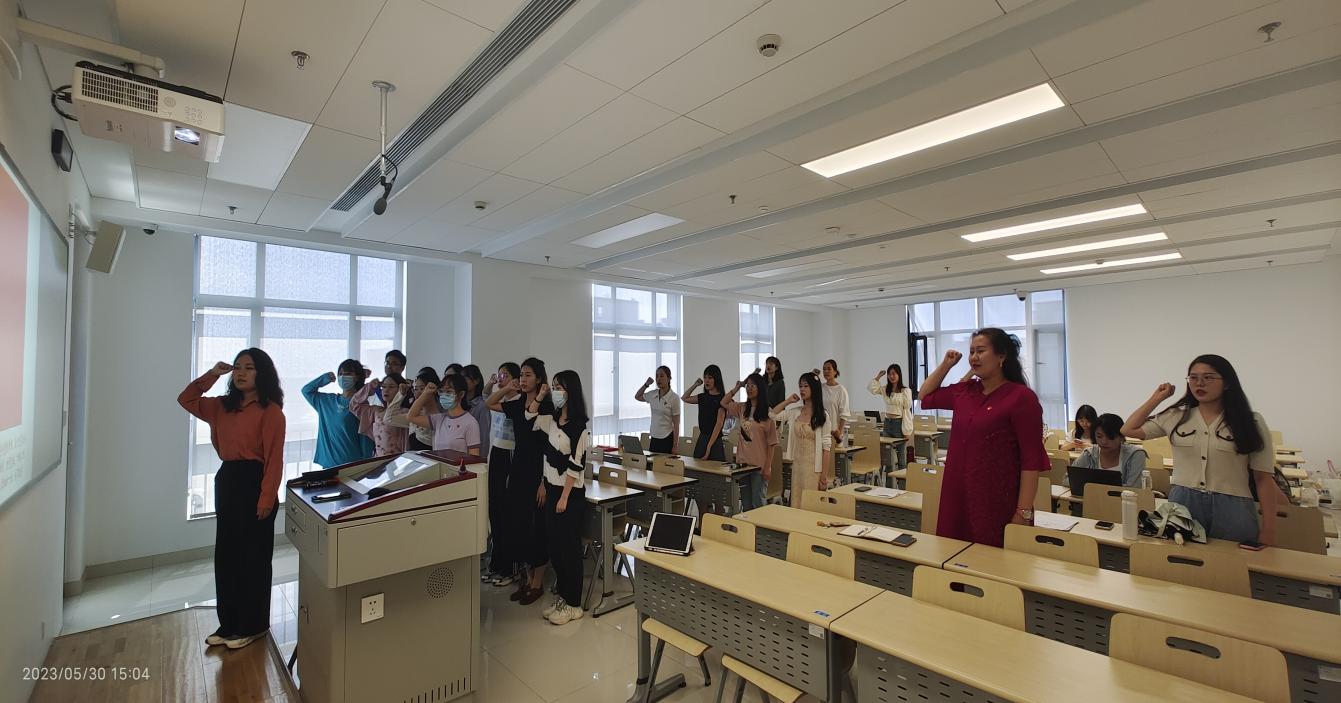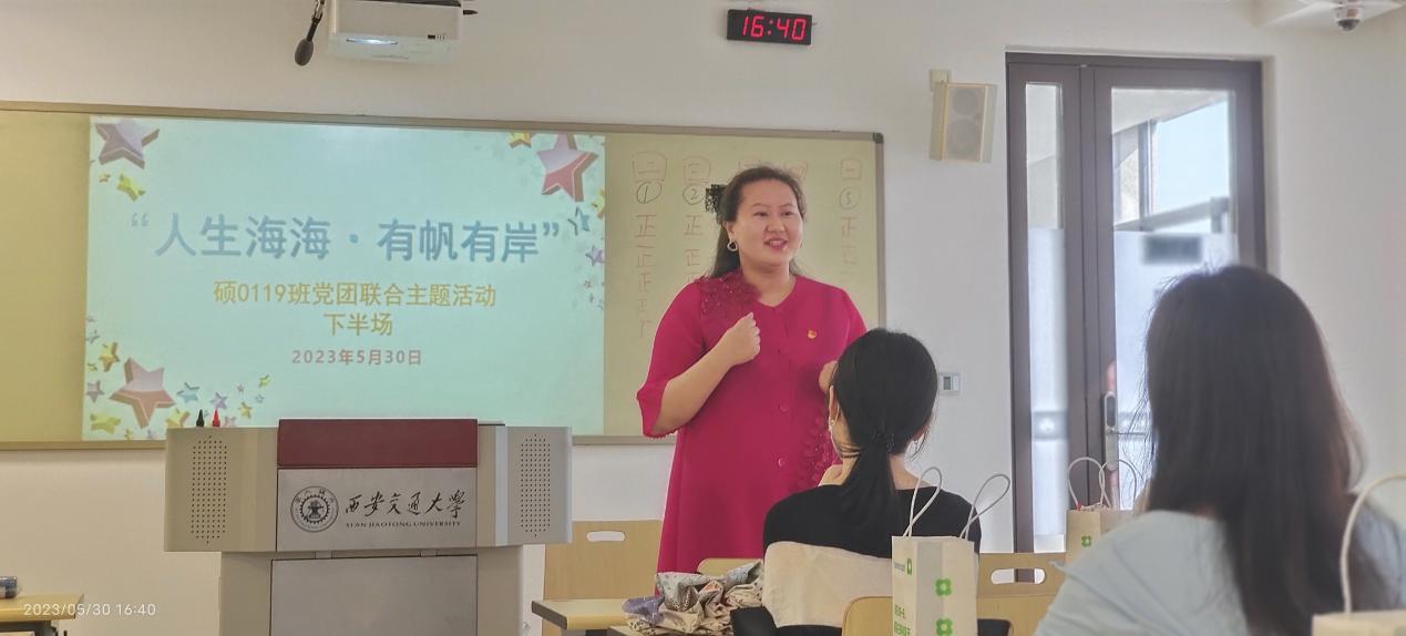 首先,刘银萍同志带领大家学习习近平总书记在中国·中亚峰会上的主旨讲话,用视频、图片等形式详细讲解了此峰会的选址原因、主要讲话精神等,内容丰富,形式多样。处于毕业季,党支部专门举办了一场党员宣誓活动,正式党员将党徽佩戴在新入党同志胸前,象征着队伍的壮大、使命的传承。杨倩萍同志作为预备党员代表发言,表示将不负党和国家的重托,继续奋斗努力。“请大家举起右拳,和我宣誓。”信仰的声音震耳欲聋,这彰显着交大学子、外院学子在新征程上的良好精神面貌和为民服务、不忘初心的坚定选择。