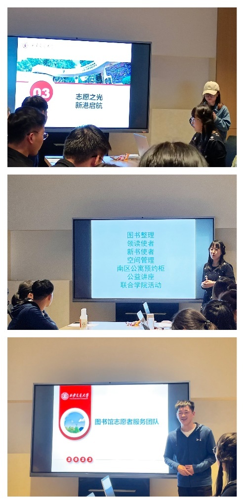 李梦姣、于欣欣和图书馆志愿者服务团队队长数学与统计学院博士张腾学长分享了志愿服务心得。首先,李梦姣同学结合自己主要负责工作,分享了图书馆志愿服务感悟。通过管理图书馆占座行为,图书馆使用秩序和环境有所改善。她提到,虽然图书馆工作较为简单,但在志愿服务过程中得到了非常宝贵的历练和成长,收获了满满的成就感。最后,她呼吁身为青年志愿者的我们要时刻传递爱心,做出自己的贡献。其次,于欣欣同学依次介绍了图书馆志愿活动并分享了自己的心得,如新书使者、图书整理、领读使者、座位管理、南区公寓预约柜调取、公益讲座、联合学院活动以及图书漂流活动等。于欣欣同学通过总结自己在图书馆志愿服务中的感悟,呼吁大家积极参与图书馆志愿服务活动,加入到志愿者服务团队的大家庭中。接着,图书馆志愿服务团队队长张腾学长介绍了图书馆志愿者服务团队的组织架构及各部门职责。各个部门统筹协调,有效推进图书馆工作开展,为同学们服务。