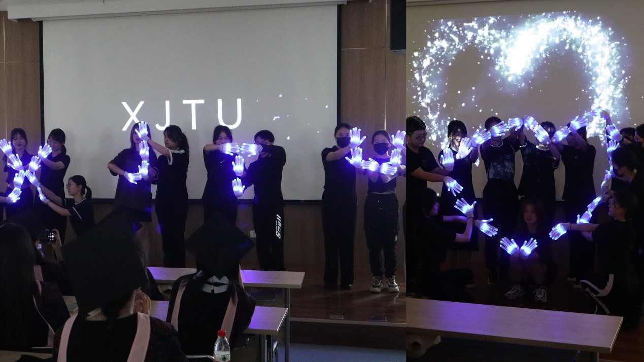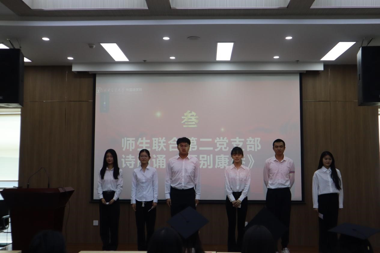 活动的第二部分,由支部内的学弟学妹们为毕业生带来手影舞《再会》和多语诗朗诵《再别康桥》。同学们通过节目向即将毕业的学长学姐们表达了最真挚的祝福。