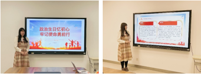 硕2118班党支部于涵英楼5-5125会议室举办“政治生日忆初心,牢记使命勇前行”主题党日活动。本次活动旨在激发青年党员的奋进热情,引导全体党员“不忘初心,牢记使命”,不断增强身份意识、责任意识和担当意识,凝聚奋进力量。本次活动由党支部书记于欣欣主持,分为“忆建党初心”“唱红色歌曲”以及“过政治生日”三个部分,支部成员们积极参加。