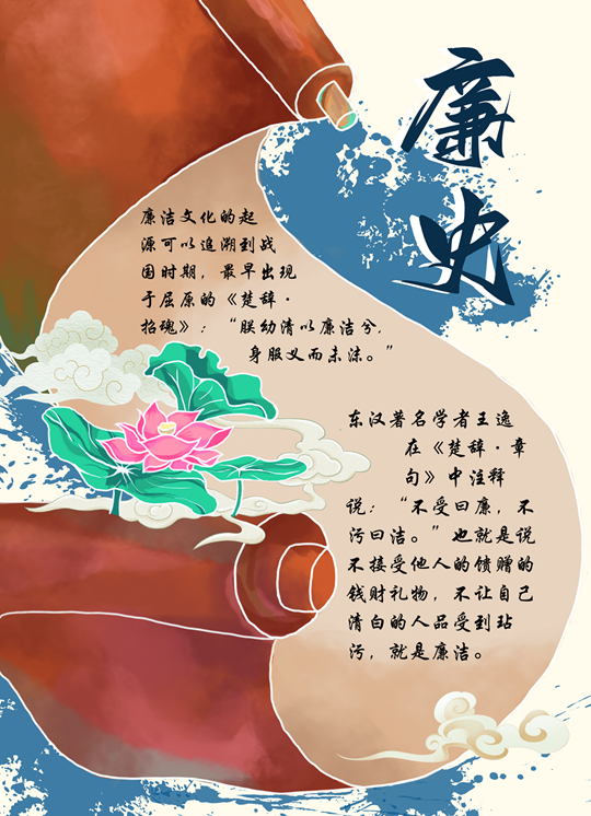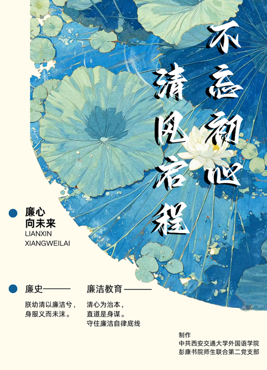 为进一步加强党员的党性教育,提高党员同志们的责任意识和廉洁自律意识,让“清廉之花”绽放在大学生党员心田,特召开此次“永葆廉洁心”主题党课。为了弘扬廉洁文化,我们设计了“清风廉洁文化教育”系列海报,整个作品以“莲”象征“廉”,贯穿其中,介绍廉洁文化的悠久历史,推古及今,阐述廉洁文化在现代社会的重要意义,宣传廉洁文化教育,倡导支部全体成员坚定理想信念永葆廉洁初心。