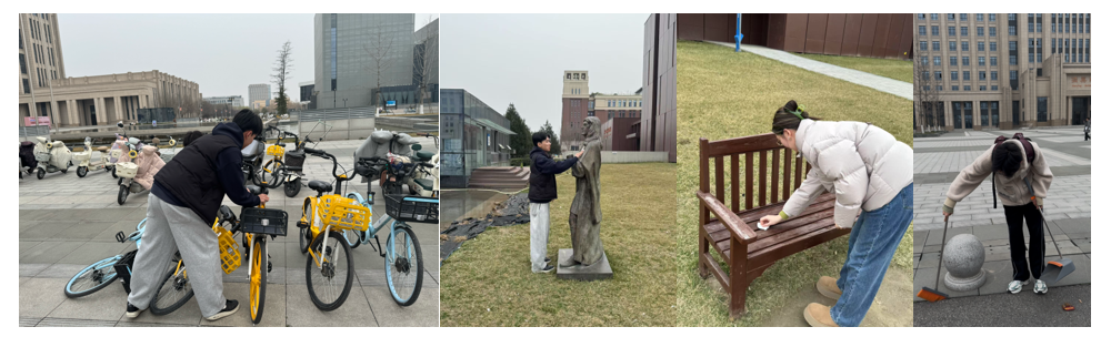 S4122班团支部分成四个小组,有序开展校园环境美化活动。文化守护组用抹布仔细擦拭校园雕像与公共座椅,让蒙尘的铜像重焕光彩;道路清洁组手持垃圾钳穿梭于林荫道,将散落的纸屑烟头分类回收;文明倡导组扶正了二十余辆倒伏的共享单车,整齐排列成靓丽风景线。