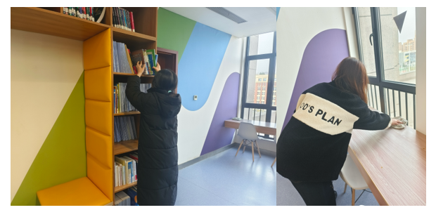 S4121班团支部走进不言书屋,认真打扫每一处角落,整理架上书籍,以实际行动为大家打造更舒适的阅读环境。