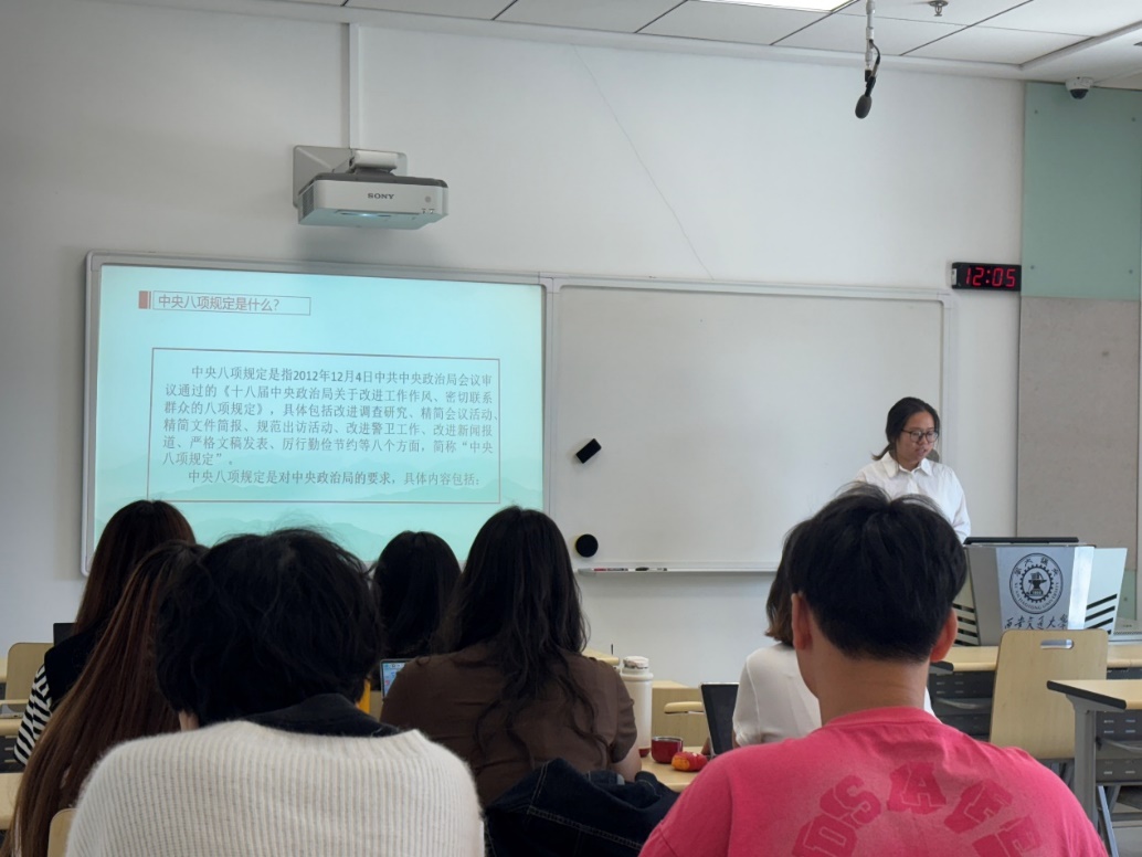 硕4121班党支部在涵英楼5-2072教室顺利开展了以“学习中央八项规定精神”为主题的组织生活。本次会议由党支部书记王佳祎主持,全体党员及部分团员积极参与,通过深入学习中央八项规定及其精神内涵,进一步强化了党支部的纪律意识和作风建设。