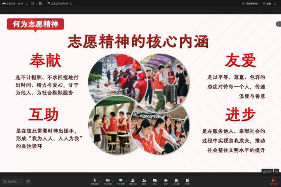 史愉涵同学分享了感动中国2024年度人物吕明玉捐献造血干细胞、带头乡村转型的感人事迹,以及韩红多年坚守慈善事业、累计捐赠上亿元并带动社会捐赠数十亿元的公益故事,提出志愿精神源于点滴善举的坚持与不变的初心。
